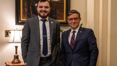 Aidan Johnston (R) (left) discussed plans to bring concealed carry reciprocity to the House floor with Speaker Mike Johnson (R).